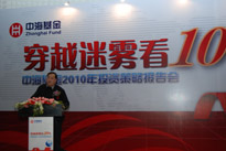 | 陳浩鳴先生為本次活動做了精彩致辭,并向所有來賓介紹了中?;?009年總體運營情況。在09年,中?;饘崿F(xiàn)了全方位提升——在引入外方股東法國愛德蒙德洛希爾銀行后,中?;鸸局卫砗惋L控更趨完善;投資研究實力得到穩(wěn)步提升,中海穩(wěn)健收益基金在全年56只同類型基金中位居榜首;中海量化策略股票型基金順利募集成立,產(chǎn)品線更趨完善;專戶“一對一”、“一對多”業(yè)務(wù)開展及業(yè)績均表現(xiàn)出色等等?!霸蕡?zhí)其中,智誠四海”。在新的一年,中?;饘⒃凇耙詫I(yè)金融服務(wù)創(chuàng)造高品質(zhì)生活”的理念指導(dǎo)下,朝“一流資產(chǎn)管理公司”的目標穩(wěn)步邁進。 |