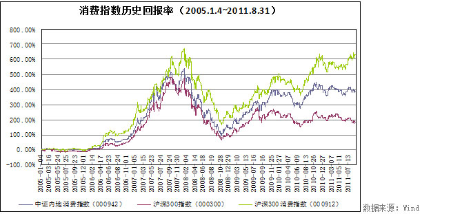 消費行業(yè)巨大的潛力催生出相應的投資機會。根據(jù)wind數(shù)據(jù)顯示,以滬深300消費指數(shù)和中證內地消費指數(shù)為例,從2005年1月4日至2011年8月31日六年半的時間里,滬深300消費指數(shù)增長630.85%、中證內地消費指數(shù)增長388.80%,同期滬深300指數(shù)增長184.17%,消費板塊顯示出長期的向上趨勢。