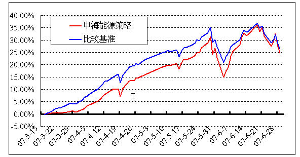 圖:中海能源策略基金累計(jì)凈值增長(zhǎng)率與同期業(yè)績(jī)比較基準(zhǔn)收益率的歷史走勢(shì)對(duì)比圖(2007年3月13日至2007年6月30日)